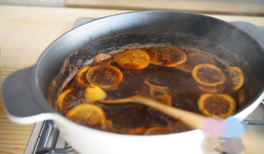⑤輪切りの柚子、カラメル、その他すべての調味料を入れて蓋をせずに弱火にかける。