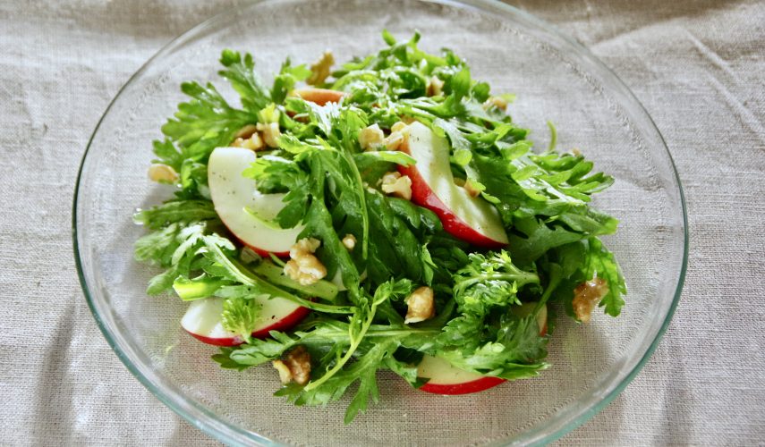 ビタミンたっぷりなレモンやりんご、ミネラル豊富なクルミをドレッシングに加え春菊とあえるだけ。
